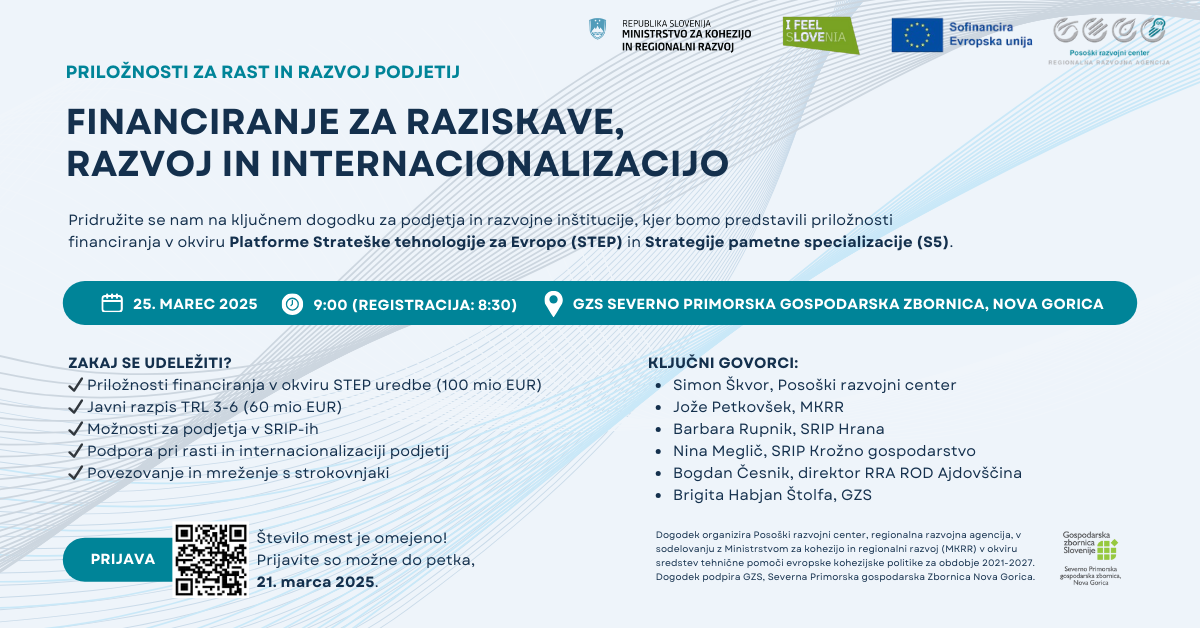 Posoški razvojni center v sodelovanju z Ministrstvom za kohezijo in regionalni razvoj organizira dogodek PRILOŽNOSTI ZA RAST IN RAZVOJ PODJETIJ, kjer bodo predstavljeni aktualni razpisi in možnosti financiranja v okviru Platforme Strateške tehnologije za Evropo (STEP) ter Strategije pametne specializacije (S5).