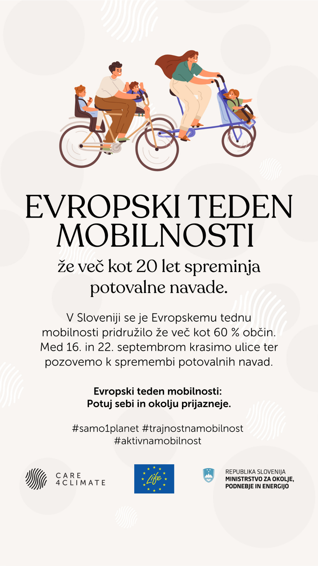 Evropski teden mobilnosti tradicionalno poteka od 16. do 22. septembra. Dogodki in kampanje, ki bodo spodbujale trajnostno mobilnost, pa bodo potekale ves mesec oziroma še dlje. Vabimo vas, da se pridružite dejavnostim, ki poudarjajo, da si vsi zaslužimo varno, zdravo in prijetno pot do šole, službe, trgovine ali parka. Skupaj se sprehodimo, usedimo na kolo, preizkusimo, kako je premagovati ovire, in prisluhnimo zgodbam sokrajanov in sokrajank. Z majhnimi koraki lahko naredimo velike spremembe za sebe, skupnost in okolje – še posebej če združimo moči.